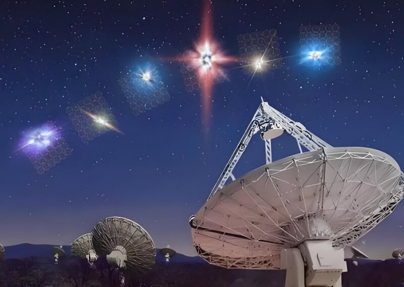 近代射電天文學(xué)揭示,來自宇宙的電波訊號(hào)是宇宙天體本身發(fā)射出來的一種射線,具有極高的能量,輻射粒子的速度接近于光速。當(dāng)這些宇宙射線進(jìn)入大氣層外層時(shí),會(huì)猛烈撞擊大氣層中的氣體分子,產(chǎn)生其他粒子。這些粒子沖擊到地面時(shí),可用儀器記錄下來,并通過計(jì)算機(jī)處理得到一個(gè)年輪樣子的圖案,即射電圖。射電圖表示射電源電波的強(qiáng)弱分布。例如,著名的射電源天鵝座A的射電圖就是兩個(gè)像眼珠似的圓斑,這兩個(gè)圓斑并不在星系本身的位置上,而是在星系兩側(cè)對(duì)稱的位置上,彼此相距30萬光年。天文學(xué)家用光學(xué)望遠(yuǎn)鏡仔細(xì)搜索這兩個(gè)“眼珠”所在的天區(qū),卻一無所獲。