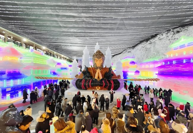 作為嘉年華的核心區(qū)域,冰燈藝術(shù)區(qū)占地面積8000平方米。這里展示了350件冰燈作品、240件冰雕作品和80件雪雕作品,每一件都堪稱藝術(shù)精品。在傳統(tǒng)冰燈藝術(shù)的基礎(chǔ)上,這些作品巧妙地融合了泡泡瑪特、西游、仙俠等熱門(mén)IP元素,劃分出蛇年賀新春區(qū)、泡泡瑪特區(qū)、西游文化區(qū)、仙俠文化區(qū)、冰川飛瀑區(qū)等多個(gè)特色區(qū)域。Q萌可愛(ài)的泡泡瑪特形象、奇幻神秘的西游仙俠角色,以獨(dú)特的藝術(shù)形式呈現(xiàn)在冰雕、雪雕之上,營(yíng)造出濃厚的節(jié)日氛圍,讓游客在欣賞冰燈藝術(shù)的同時(shí),也能感受到熱門(mén)IP的獨(dú)特魅力。