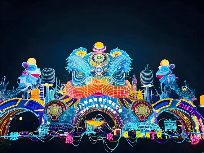這個(gè)園區(qū)用賽博朋克風(fēng)格引領(lǐng)科幻與傳統(tǒng)新風(fēng)潮,打造了時(shí)尚潮玩世界和年輕人的二次元虛擬世界。燈組“齊天大圣”以金屬線條勾勒輪廓,金箍、火眼金睛、如意金箍棒等細(xì)節(jié)栩栩如生。在燈會(huì)2號(hào)門(mén)附近,“賽博醒獅”以超大型天穹式大門(mén)組燈的形式,將傳統(tǒng)舞獅與現(xiàn)代科技、未來(lái)主義朋克風(fēng)格相融合,彰顯出大灣區(qū)的創(chuàng)新活力。